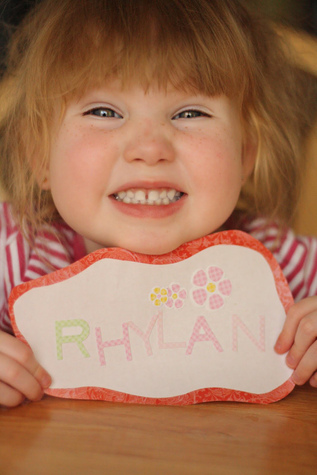 I have been working a lot with Rhylan on the letters in her name! We spell her name in the bath with foam letters, we use letter stamps to write it, we use stickers, and magnet letters. We play memory with these letters and any other way I can think of! It is paying off. Today we made a sign for her room. She found all the letters and put them on herself with very little help. She even remembered the order of the letters! What a little smarty:)
